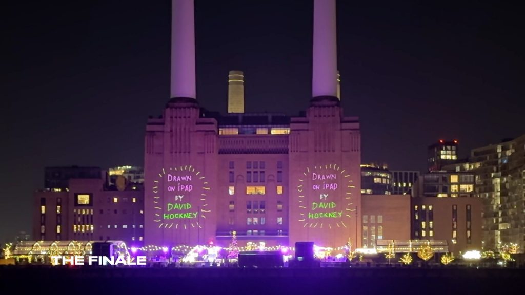 Hockney’s stunning animation transforms the iconic 100-metre-high chimneys that overlook the River Thames.