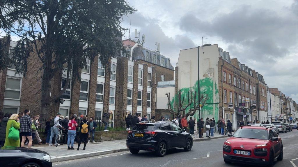 The mural appeared overnight on the side of a building on Hornsey Road in Finsbury Park. Banksy confirmed it is his work.