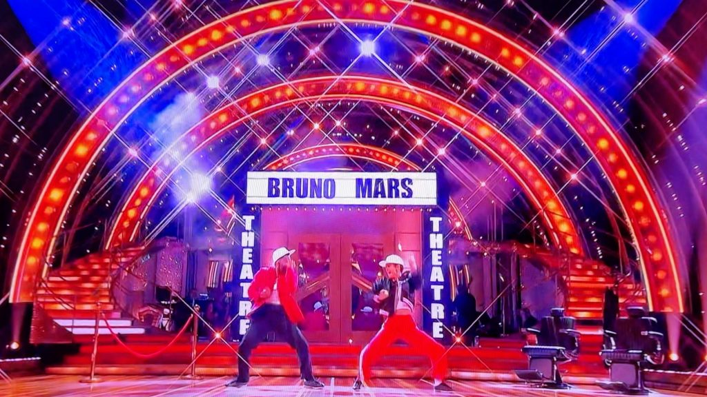 Tessa introduced JB Gill and Lauren Oakley ahead of their Couple’s Choice to a Bruno Mars medley.