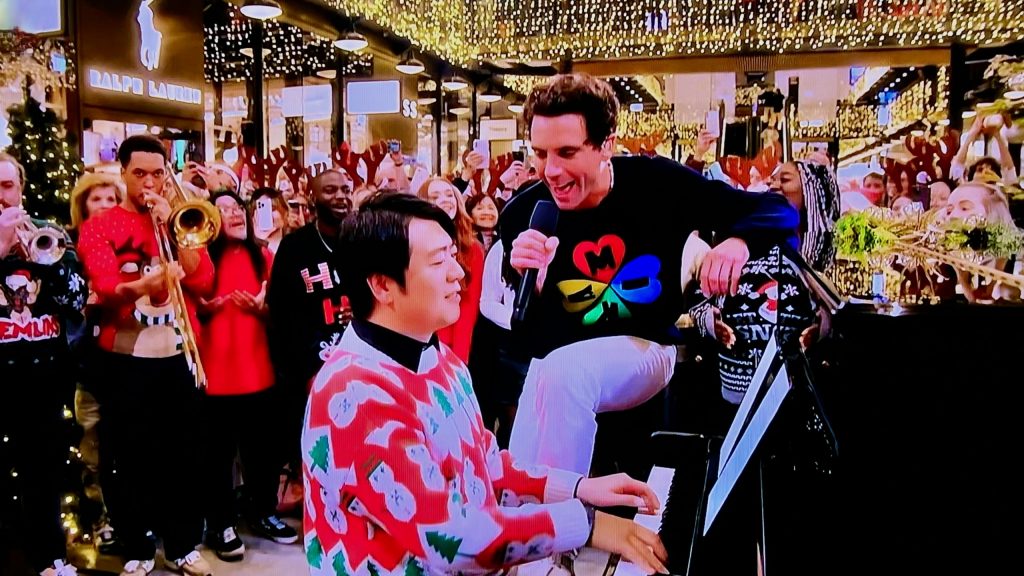 Claudia Winkleman, Mika and Lang Lang are back with their iconic travelling piano, to celebrate Christmas at Battersea Power Station in London.