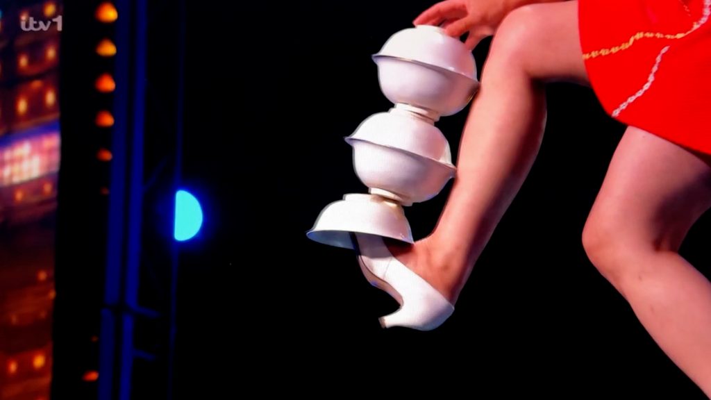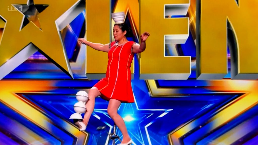 BGT: Unicyclist tosses plates on to her head