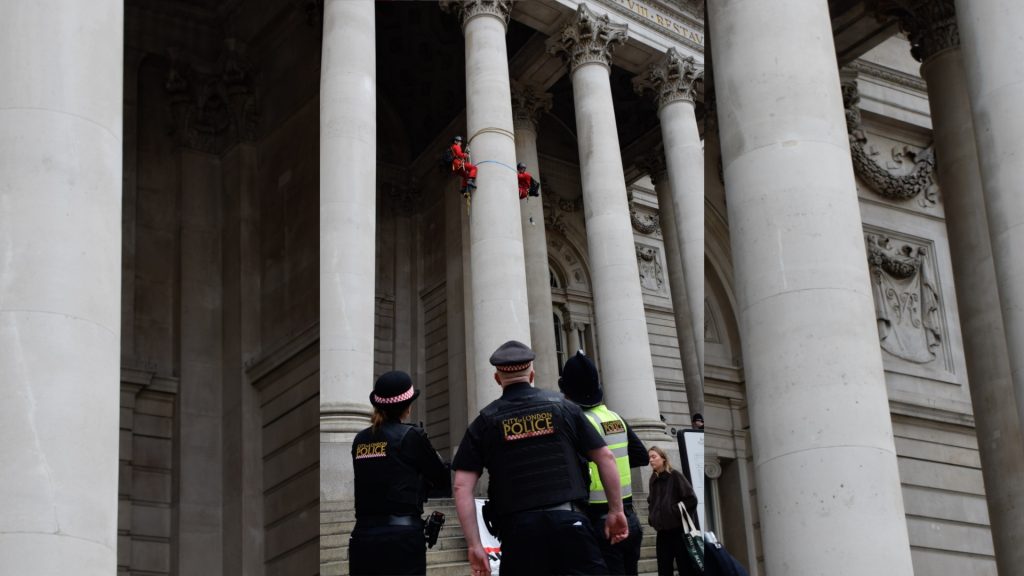 Two people were arrested for climbing a building to drop a banner in central London. Other protesters ‘crashed’ insurers offices and occupied foyers.