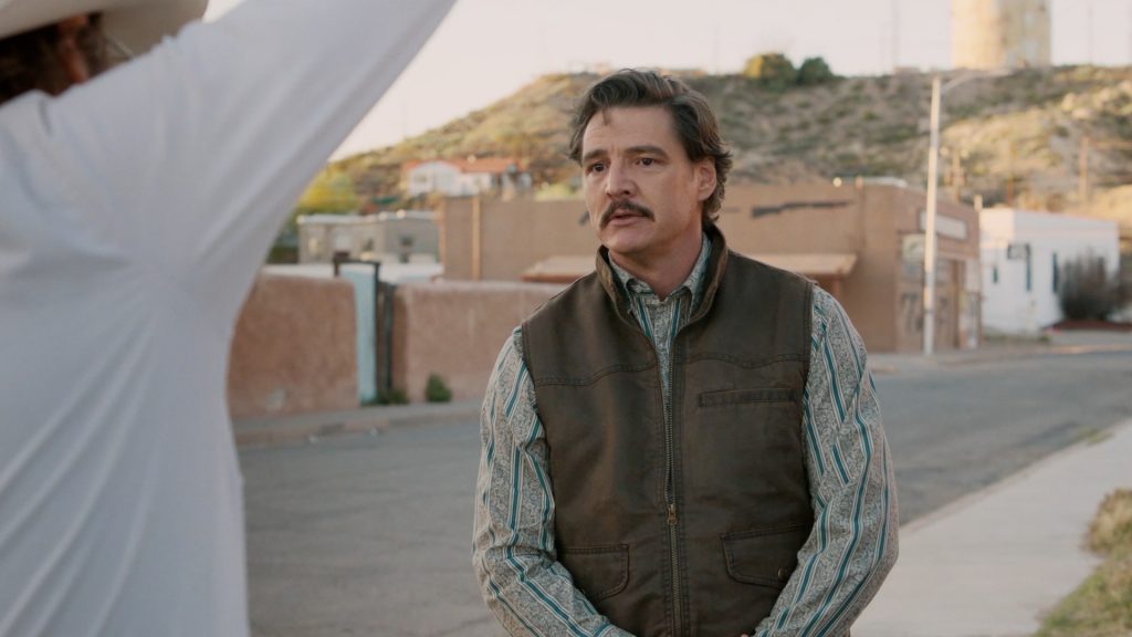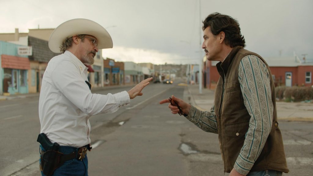 Eddington is a fictional small town in New Mexico in the US, bordering Native American territory; we join the story as the Covid lockdown begins (though Trump is oddly unmentioned in all the news programmes and viral TikToks everyone’s watching) and Mayor Ted Garcia (Pedro Pascal) and Sheriff Joe Cross (Joaquin Phoenix) are at loggerheads – interestingly taking opposite sides to their counterparts in Spielberg’s Jaws on the personal liberty issue.