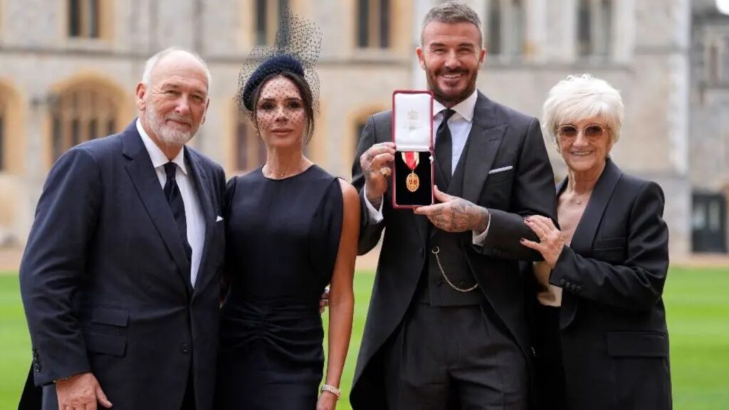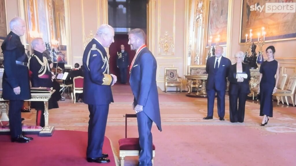 The former Manchester United and England star was accompanied by his wife – now known as Lady Beckham – and his parents, Ted and Sandra, as he was honoured for his services to sport and charity.