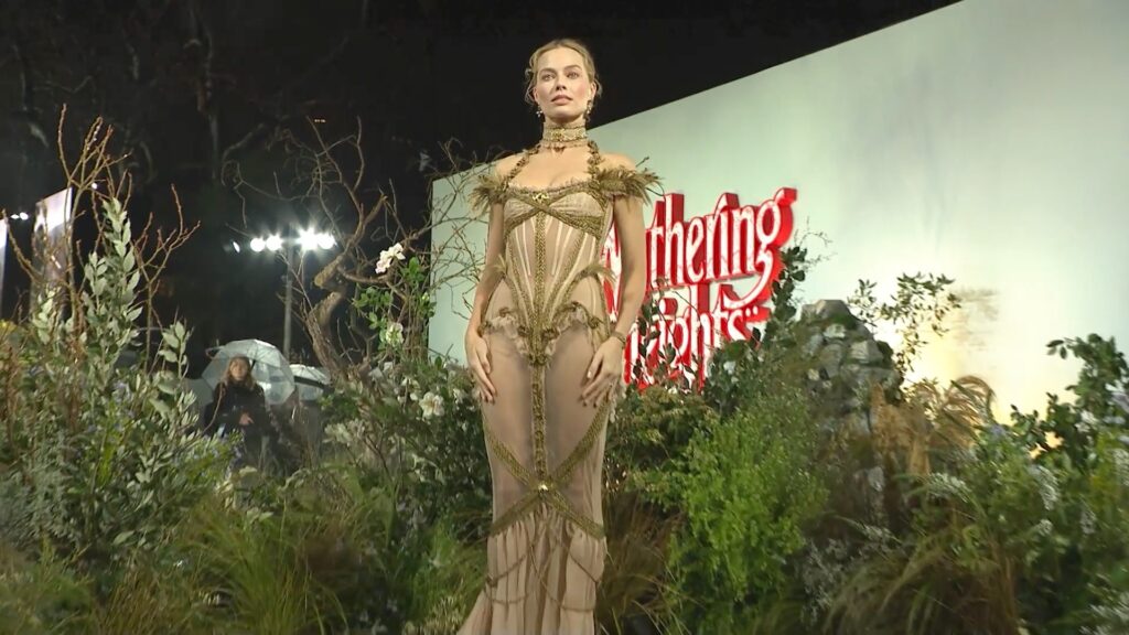 Margot stunned in near naked gown. Join the two in London’s Leicester Square to launch the Warner Brothers film.